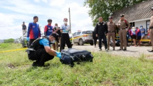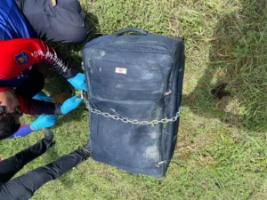 เมื่อเวลา 06.30 น. 3 กันยายน 68 ร.ต.ท. มินทราทิตย์ ทองใส รองสารวัตร (สอบสวน) สภ.ห้วยใหญ่ ได้รับแจ้งว่าพบกระเป๋าเดินทางถูกล่ามโซ่ ส่งกลิ่นเหม็นเน่า ลอยอยู่ในอ่างเก็บน้ำคลองบางไผ่ ม.11 ต.ห้วยใหญ่ อ.บางละมุง จ.ชลบุรี หลังรับแจ้งรายงานให้ผู้บังคับบัญชาทราบ แล้วพร้อมด้วยตำรวจชุดสืบสวน ตำรวจพิสูจน์หลักฐาน 2 ชลบุรี (พฐ.) แพทย์เวร และ หน่วยกู้ภัยมูลนิธิสว่างบริบูรณ์ธรรมสถานเมืองพัทยา รุดไปทำการตรวจสอบที่เกิดเหตุเป็นอ่างเก็บน้ำขนาดใหญ่ อยู่ในพื้นที่เขตรอยต่อระหว่าง อ.บางละมุง จ.ชลบุรี กับ อ.บางฉาง จ.ระยอง และเป็นสถานที่ฝึกซ้อมนักกีฬาทีมชาติเรือพาย ของสมาคมกีฬาเรือพายแห่งประเทศไทย โดยจากการตรวจสอบเบื้องต้น พบกระเป๋าเดินทางขนาดใหญ่ สีดำ มีโซ่เหล็ก พันล้อมรอบกระเป๋า ล็อกด้วยแม่กุญแจ โซ่ถูกรัดทับด้วยสายเคเบิลไทร์ 4 จุด และจุดล็อกซิปกระเป๋า 1 จุด ภายในกระเป๋ามีกลิ่นเน่าเมื่อเจ้าหน้าที่ยกกระเป๋าขึ้นมาตรวจสอบบนฝั่ง โดยมีการตัดแม่กุญแจออกแล้วเปิดกระเป๋าดู พบศพหญิงสาวไม่ทราบสัญชาติ อายุประมาณ 30 ปี ไม่สวมเสื้อ เปลือยท่อนบน นุ่งกางเกงขา 3 ส่วนสีครีม นอนขดตัวคุดคู้อยู่ในกระเป๋า สภาพศพเสียชีวิตมาแล้วประมาณ 5 วัน โดยยังไม่สามารถตรวจสอบร่องรอยบาดแผลบนร่างกายของผู้ตายได้ นอกจากนี้ช่องใส่ของด้านหน้ากระเป๋า พบแผ่นดัมเบล 9 แผ่น (5 กก. 1 แผ่น, 2.5 กก. 3 แผ่น, 1.5 กก. 1 แผ่น และ 0.5 กก. 4 แผ่น) เจ้าหน้าที่จะเก็บไว้เป็นหลักฐาน