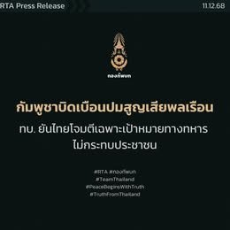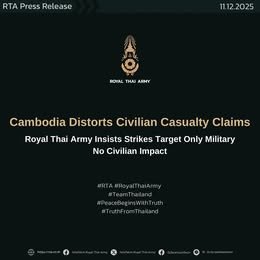 วันที่ 11 ธันวาคม 2568 เพจเฟซบุ๊ก ทีมโฆษกกองทัพบก Army Spoke Team โพสต์ข้อความชี้แจง กรณีกระทรวงกลาโหมกัมพูชาเผยแพร่ภาพอินโฟกราฟฟิก เมื่อ 11 ธ.ค.68 ระบุว่า “การกระทำอันเป็นการรุกรานด้วยอาวุธของไทยได้ก่อให้เกิดความเสียหายอย่างร้ายแรง โดยจนถึงวันที่ 10 ธ.ค. 68 พลเรือนได้เสียชีวิตเพิ่มขึ้นเป็น 10 ราย (ทารก 1 ราย) และมีผู้ได้รับบาดเจ็บซึ่งเป็นพลเรือนจำนวน 60 ราย ขอเรียกร้องให้ประชาคมระหว่างประเทศประณามต่อการละเมิดคำประกาศร่วมข้อตกลงสันติภาพระหว่างกัมพูชาและไทย รวมถึงการกระทำอาชญากรรมสงครามและการกระทำผิดกฎหมายของไทยครั้งแล้วครั้งเล่า พร้อมทั้งเรียกร้องให้ไทยรับผิดชอบต่อการละเมิดอันอุกอาจเหล่านี้